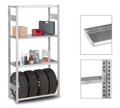 Regał do garażu łączy w sobie trzy regały: półkę do składowania opon/felg, półkę wannową na oleje i płyny oraz zwykłą półkę do składowania narzędzi. Wysokości zawieszenia półek można łatwo zmieniać bez konieczności rozkręcania w odstępach co 25mm. Zapewnia to maksymalną elastyczność i dopasowanie do indywidualnych wymagań. Istnieje możliwość zamontowania dodatkowych półek.