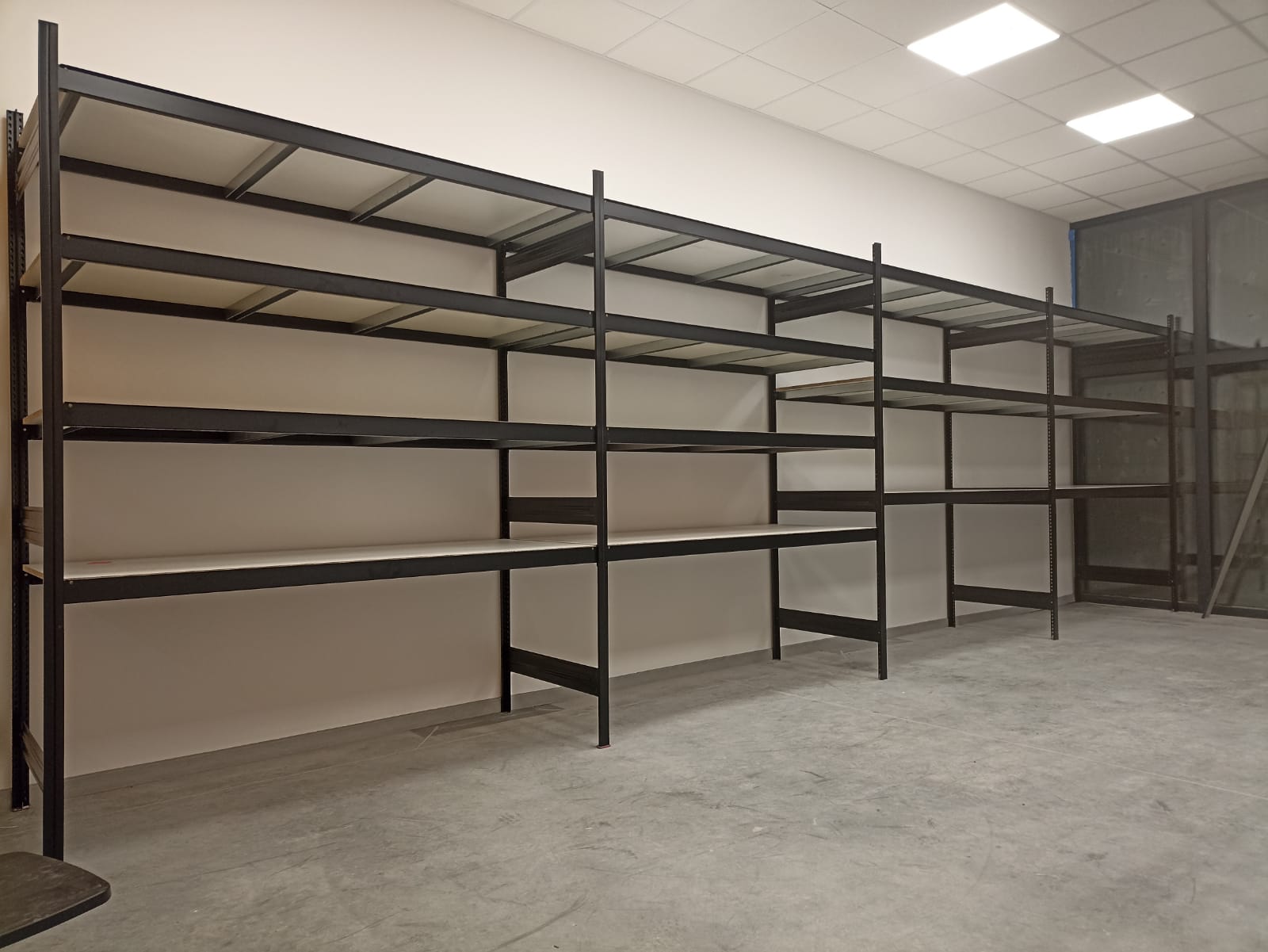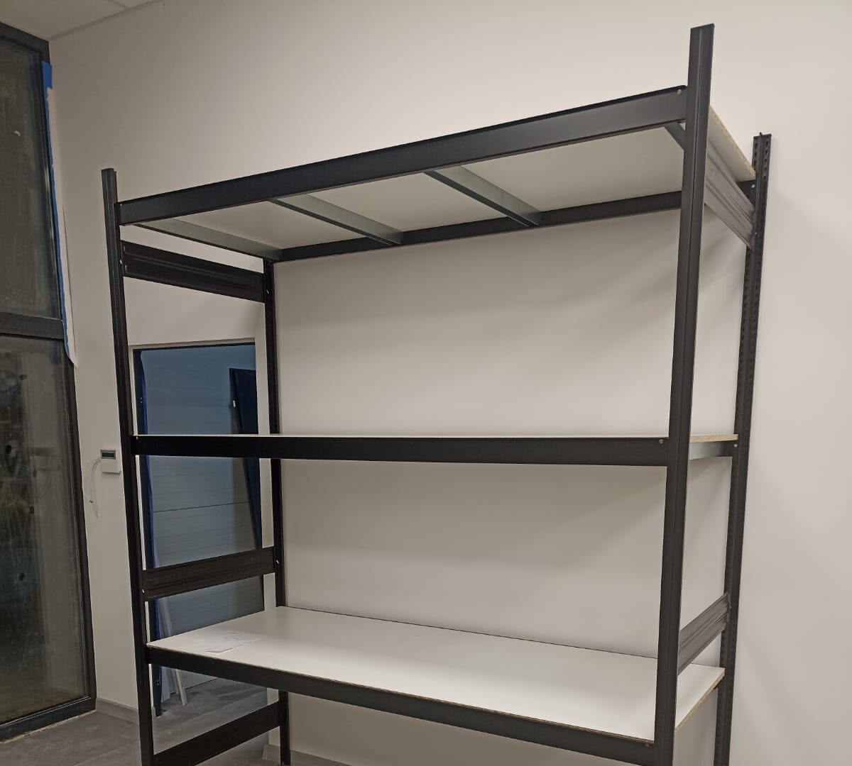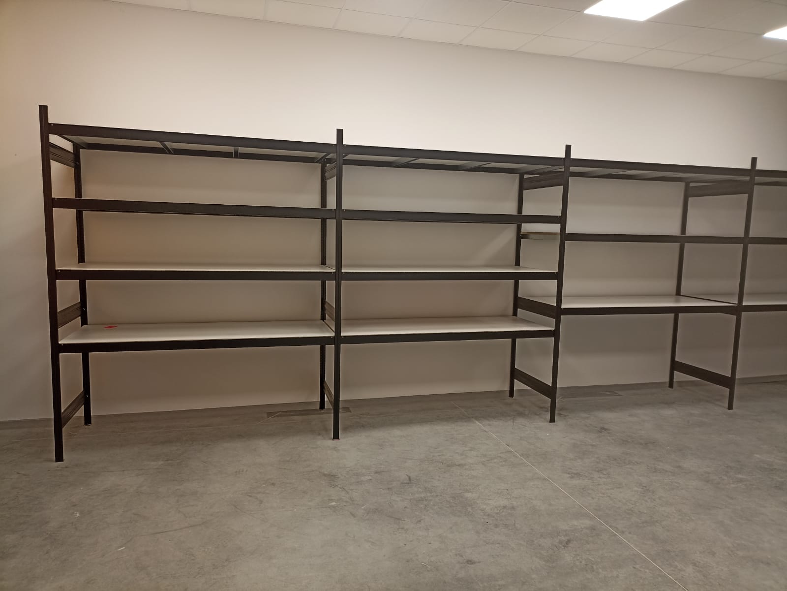 Jako alternatywą dla płyty wiórowej oferujemy wypełnienie z półki metalowej ocynkowanej. Półki – podobnie jak płytę wiórową umieszczamy na konstrukcji zbudowanej z 2 mocnych trawersów nośnych i poprzeczek. Dodatkową zaletą jest bezśrubowa regulacja poziomów półek co 2,5 cm.