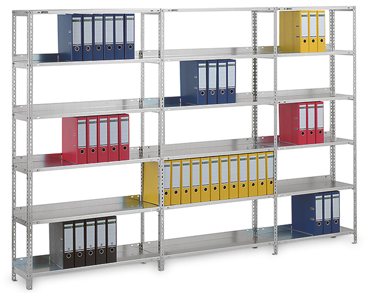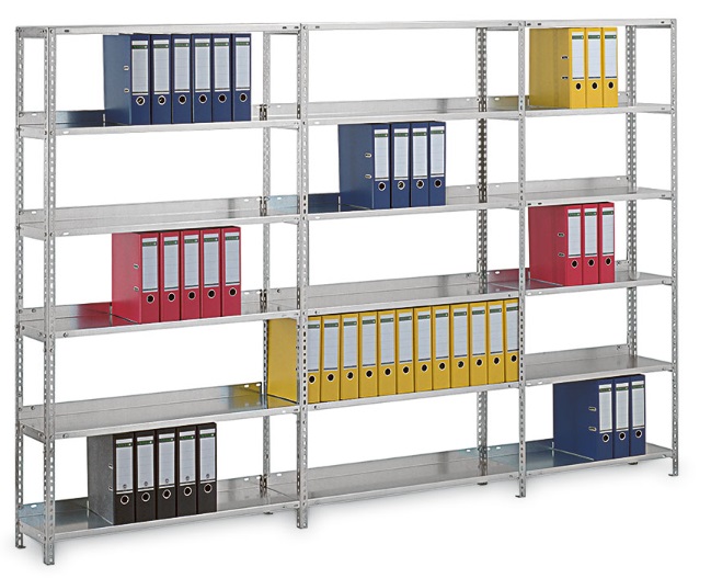 Regały półkowe na dokumenty w systemie skręcanym jednostronnym wykorzystywane są do biura i archiwum. Przeznaczone są do składowania standardowych segregatorów na dokumenty formatu A4. W standardowej wersji regały występują  w wersji ocynkowanej.