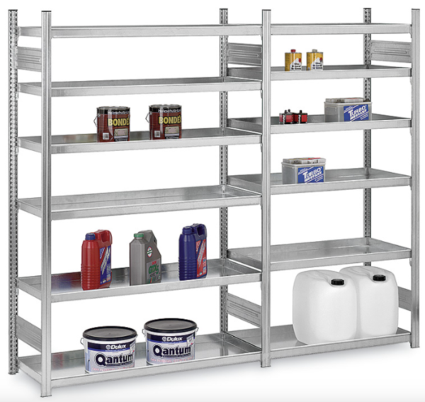 Solidne półki o nośności 200 kg przeznaczone są do przechowywania olejów, środków czyszczących, farb itp. Jeżeli z pojemnika wycieknie przypadkowo płyn, zostanie on zgromadzony na półce, nie zanieczyszczając przestrzeni magazynowej. Regały można uzupełniać o dodatkowe półki wannowe oraz inny asortyment dostępny w systemie regałów klipowych.